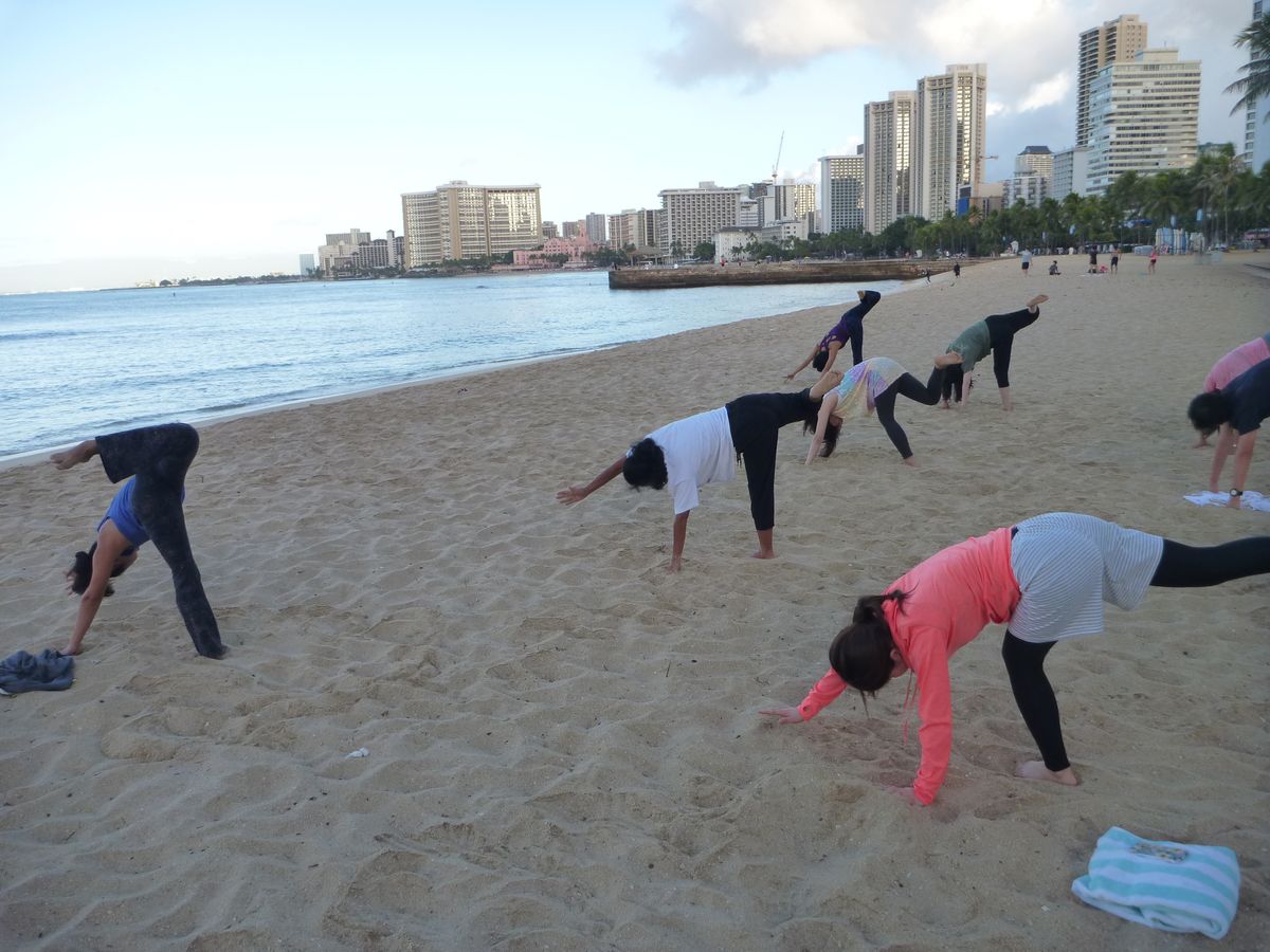 夫婦で参加しました。朝6時、まだ薄暗い中、動物園前に集合しました。少し冷たい空気の中、ホテルから歩いて行きました。参加者は10名程で、ビーチに向かって5分ほど歩き、ヨガスタート。初めてのヨガだったので、なかなか美しいポーズをとることに苦戦しましたが、普段使わないところが鍛えられました。体が硬いことを痛感した1時間半でしたが、終了した時は朝日が昇って、ビーチからハワイの朝を迎えることができ、気持ちのいい朝の始まりになりました。またハワイに行った時は参加したいと思います! One more breath!
