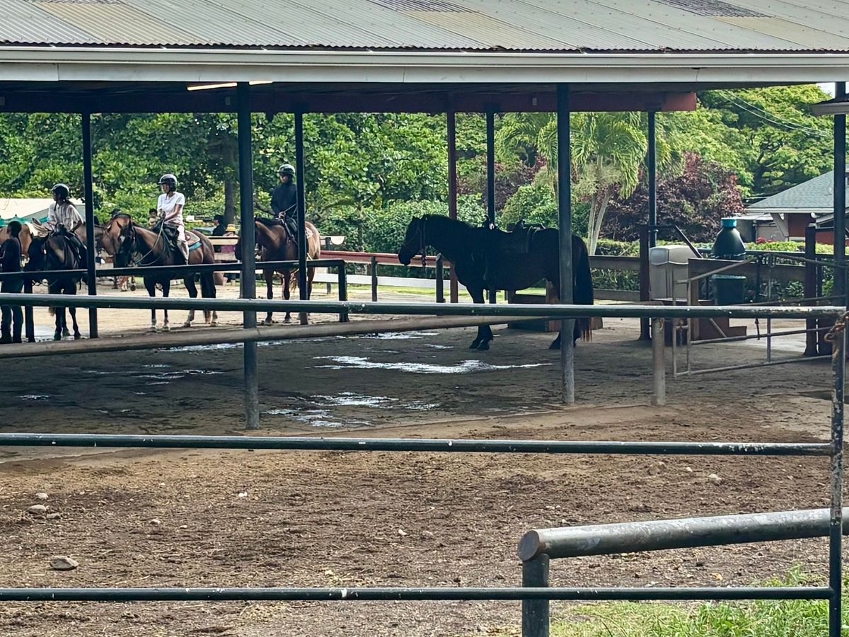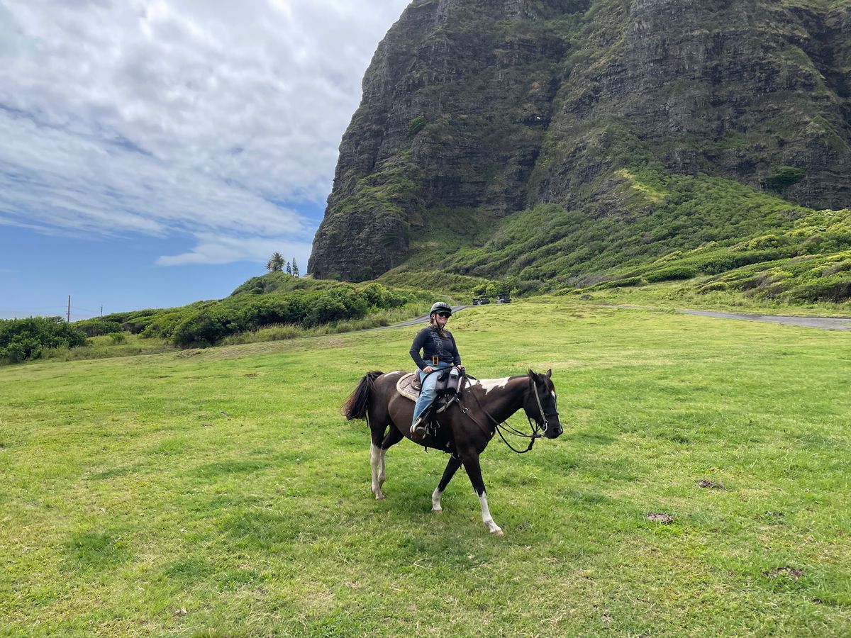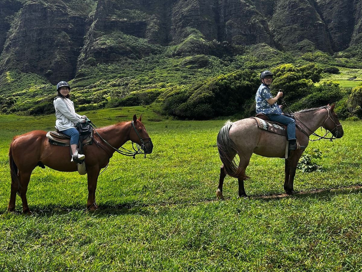 ホテルからの送迎付きプランだったので、大型バスで1時間ほどかけて現地まで行きました。乗馬中のインストラクターさんからの声掛けは英語ですが、事前に日本人のスタッフの方からの説明もあったので、英語がわからなくても大丈夫だと思います。参加者は日本人が多めで中国人、韓国人、欧米の方も結構いました。アクティビティの前後にそれぞれ1時間弱自由時間があったので、売店で軽食を買ったりのんびり散歩したりして過ごしました。ワイキキエリアとはまた違った雰囲気の中で自然を感じることができてとても良かったです。