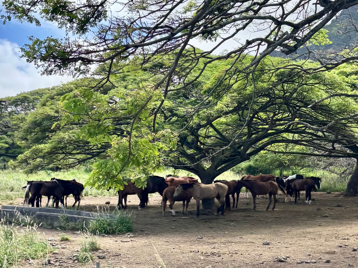 北海道で数回,2時間ほどの乗馬トレッキングをしたことがあり,ハワイの馬も同じ足や手綱での指示で,進む・止まる・曲がる,をしてくれます。万国共通。