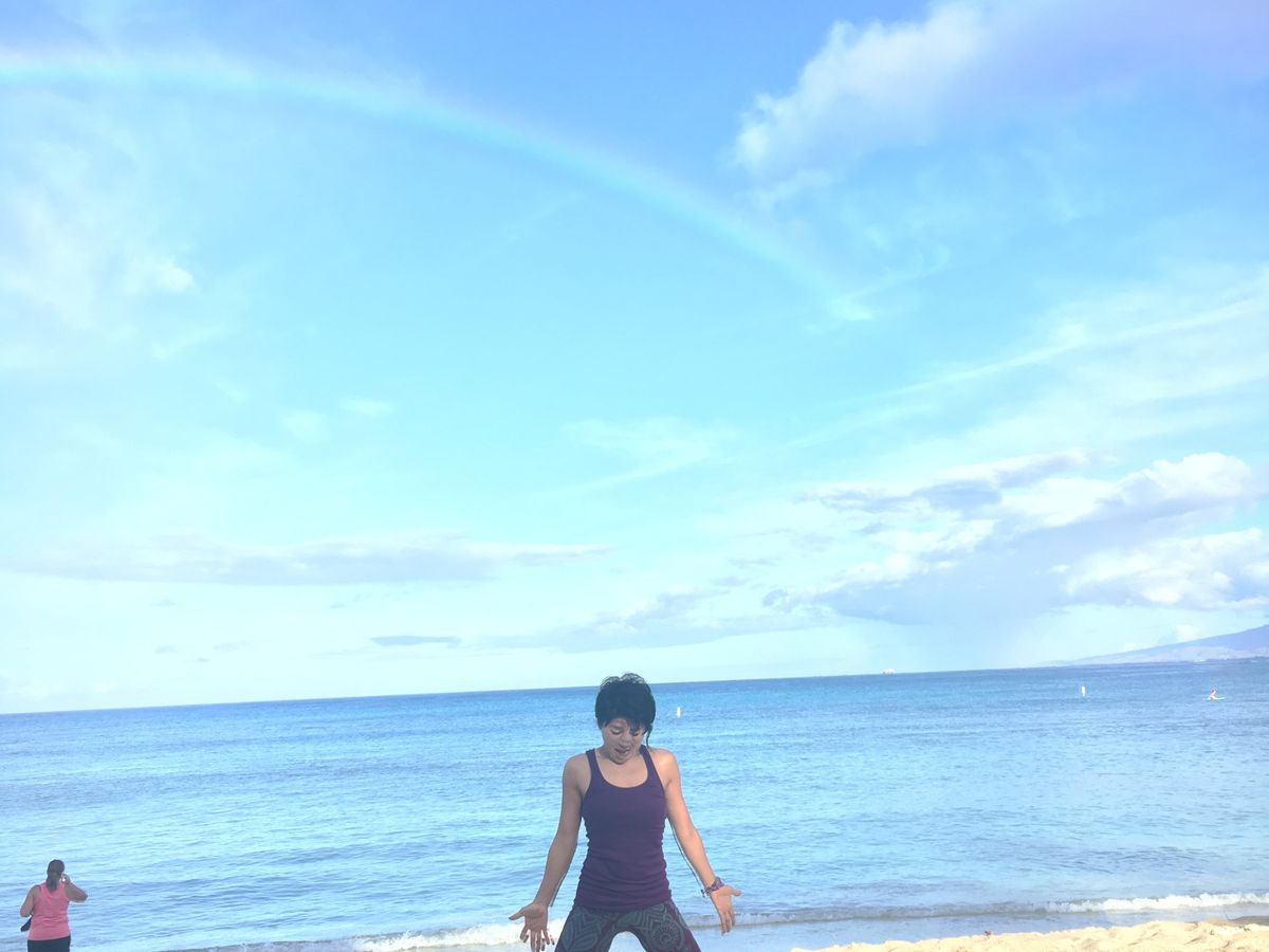時折パラパラと雨が降りましたが中断することなくレッスンが続きました。雨のおかげで、綺麗な虹を見ながらヨガをすることができました。私の付き添いで参加した夫も、ヨガを楽しんでました。早朝から気持ちよく体を動かしたので、1日アクティブに過ごすことができ、参加してよかったです。