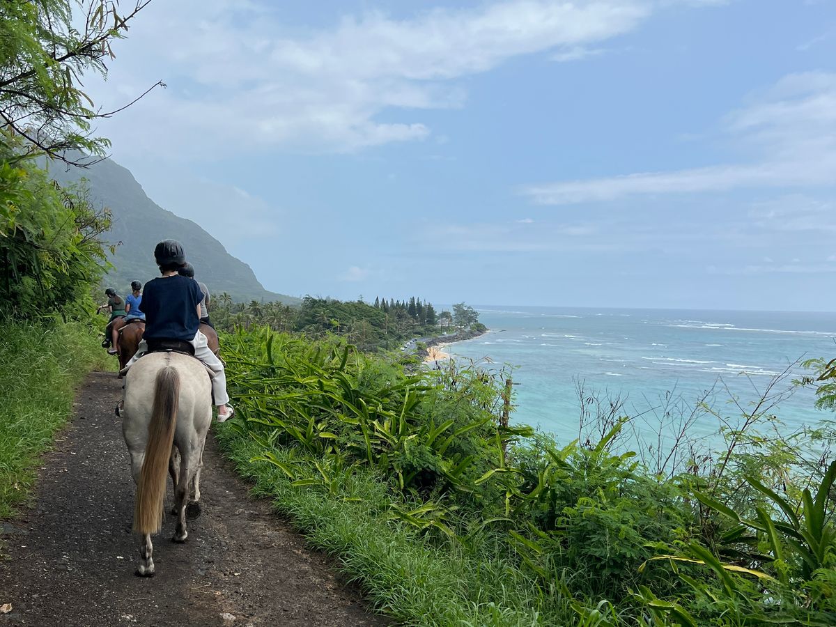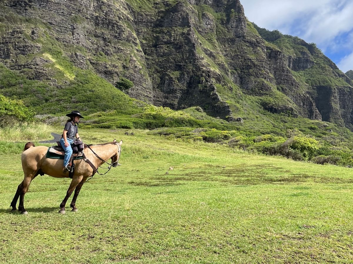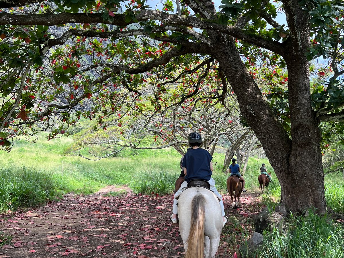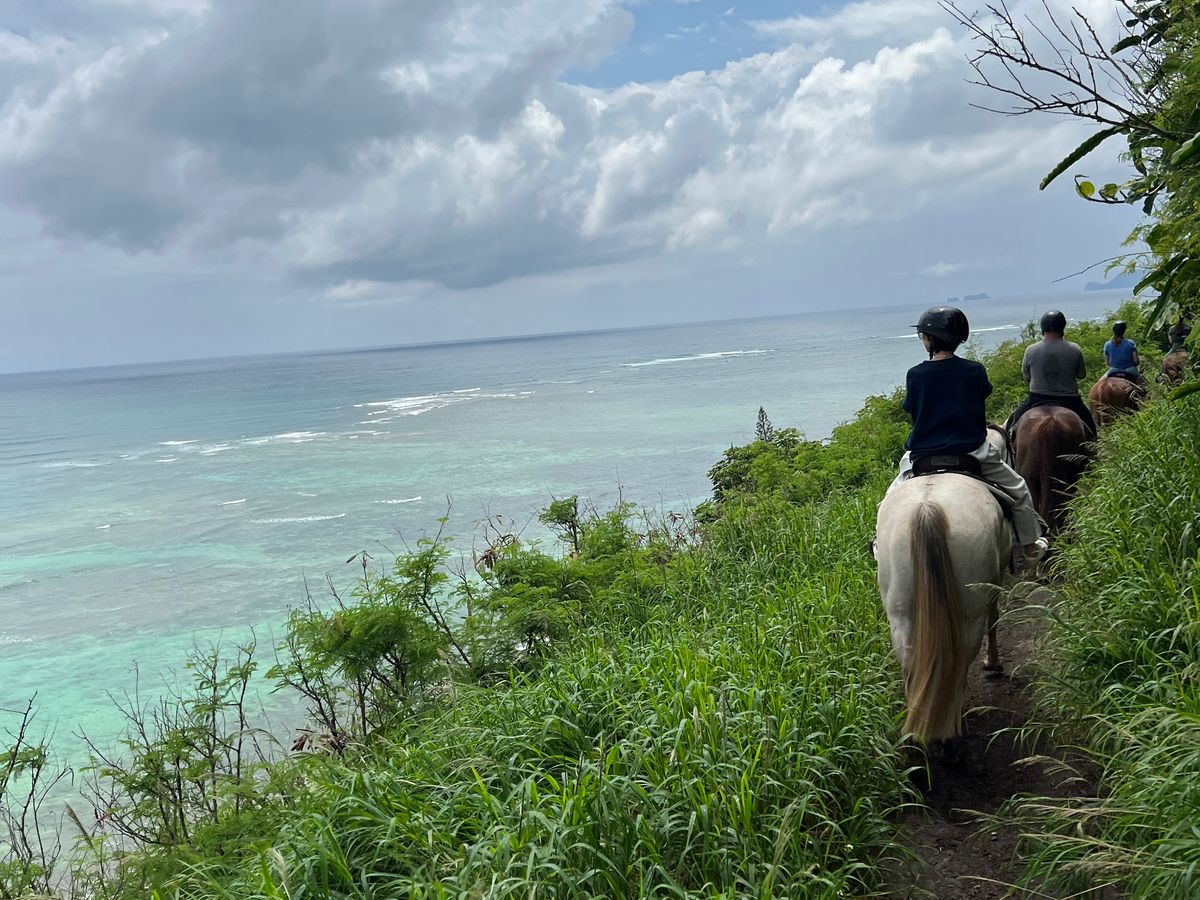 ハワイで乗馬したいと思い、こちらを申し込みました。2時間の乗馬コースです。実は、10年以上前まで乗馬クラブに通っていたのですが、駆け足がこわまなって辞めてしまった経験があります。今回は、馬に乗って大自然の中をゆっくり歩くだけなので、まったく怖くなく、久しぶりの乗馬を堪能できました。そもそも馬に乗るのが数年ぶり(北海道で何年か前にのっこたとがある)でしたので、最初はちょっと感覚を取り戻すのに時間がかかりましたが、途中から感覚を思い出し、それからは景色を堪能できました。乗る少し前に激しいスコールがあり、どうなるかと思いましたが、運よく乗馬中は、まったく雨に降られることなく、かといって暑すぎずに曇り気味だったので涼しくてちょうどよかったです。