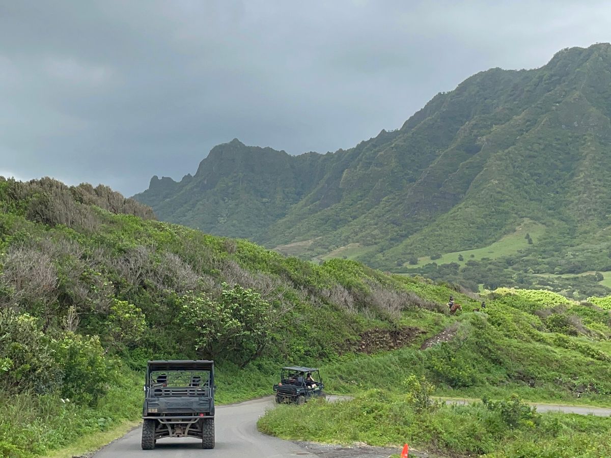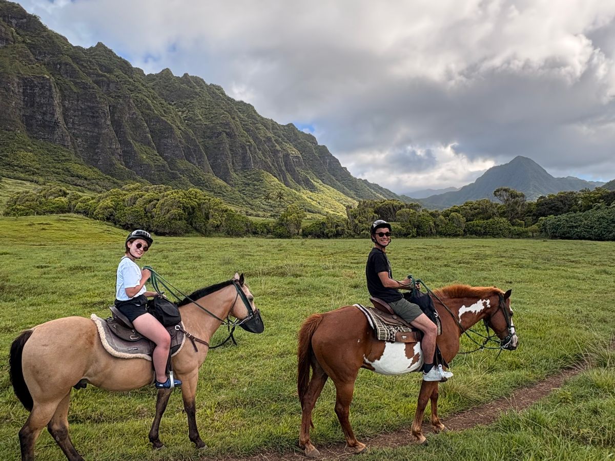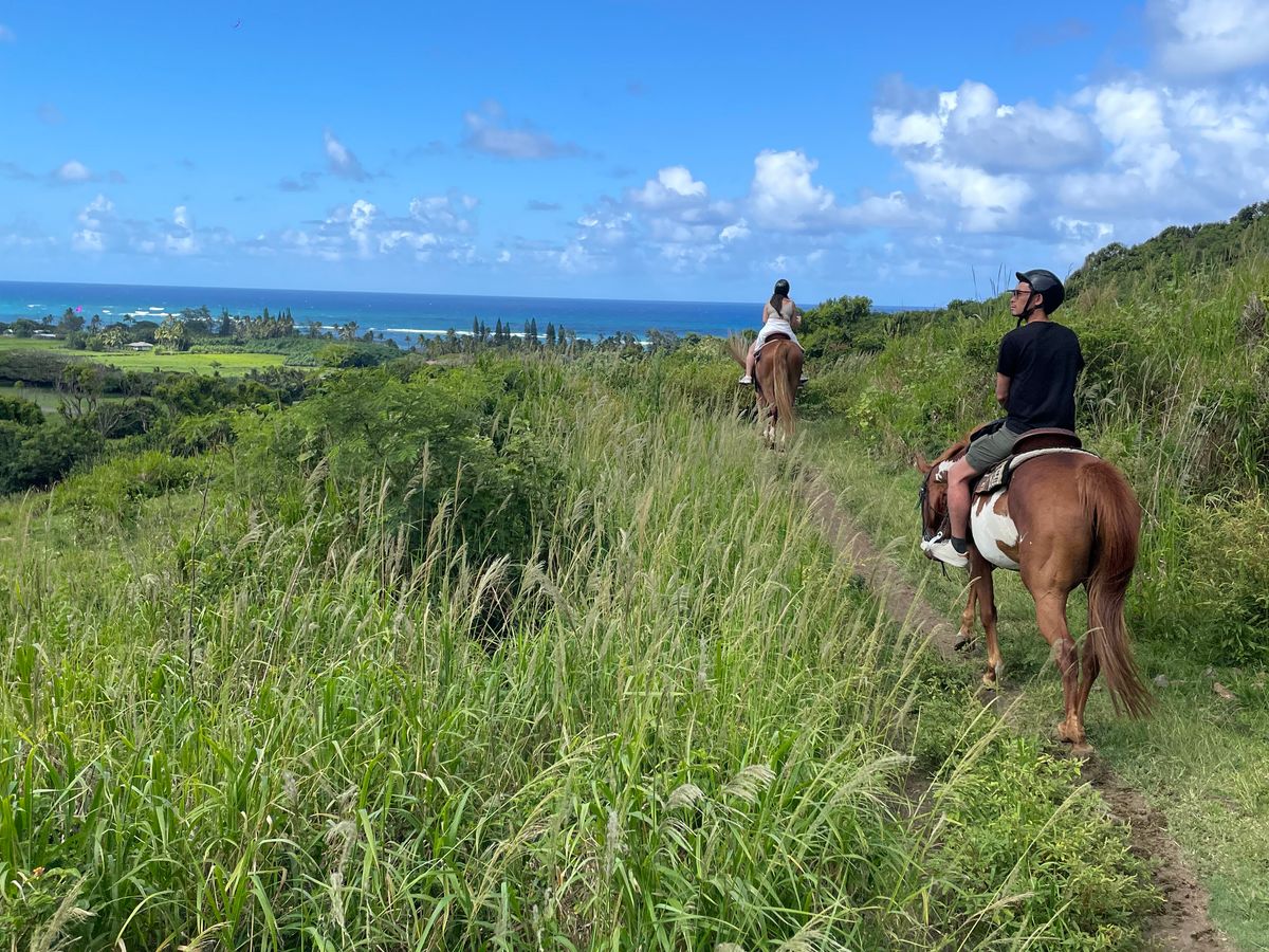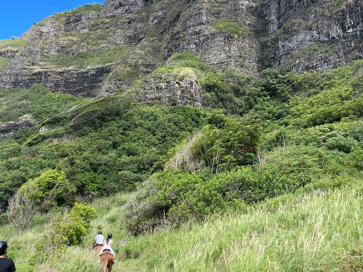 ハワイで乗馬したいと思い、こちらを申し込みました。2時間の乗馬コースです。実は、10年以上前まで乗馬クラブに通っていたのですが、駆け足がこわまなって辞めてしまった経験があります。今回は、馬に乗って大自然の中をゆっくり歩くだけなので、まったく怖くなく、久しぶりの乗馬を堪能できました。そもそも馬に乗るのが数年ぶり(北海道で何年か前にのっこたとがある)でしたので、最初はちょっと感覚を取り戻すのに時間がかかりましたが、途中から感覚を思い出し、それからは景色を堪能できました。乗る少し前に激しいスコールがあり、どうなるかと思いましたが、運よく乗馬中は、まったく雨に降られることなく、かといって暑すぎずに曇り気味だったので涼しくてちょうどよかったです。