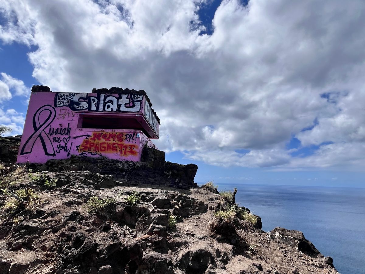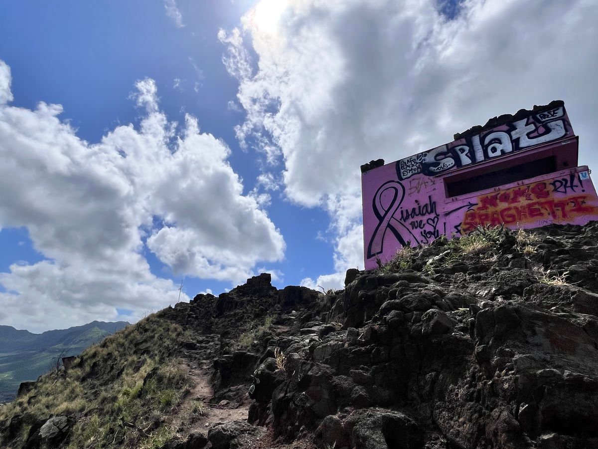 ピンクピルボックスは普段運動しない私(50代)には思っていたより険しくキツい道のりでしたが、着いた時の達成感、綺麗な景色に疲れは吹き飛びました。降りる時は滑るので要注意です。かなり気をつけてはいましたが、滑って肘を擦りむいてしまいました。なるべく滑らないスニーカー(登山用)があると安心だと思います。かなり汗をかくのでタオルも必要です。