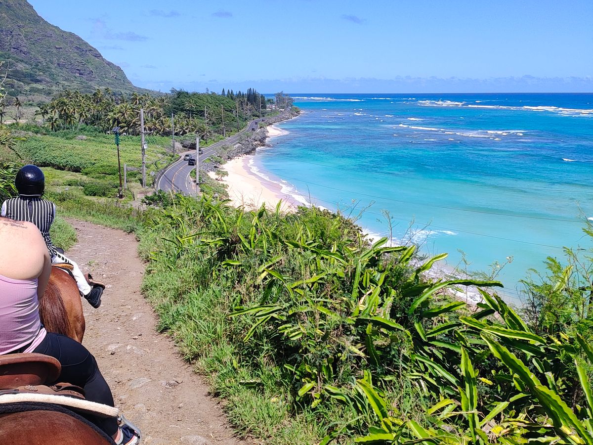 ハレイワ観光と海辺で乗馬をしたくて申し込みました。乗馬は最初落ちそうで心配でしたが、とてもかしこいお馬さんのおかげですぐ慣れました。浜辺を長時間乗馬できるなんて夢のような時間でした。途中雨が降ってきてズボンや髪がかなり濡れましたが、レインコートを貸してもらえたので上半身は濡れなくてよかったです。ハレイワでの時間が短すぎて、昼ごはんを食べてお店を1軒見ただけで終わってしまい残念でした。もっとハレイワでの散策の時間が長ければ最高です!