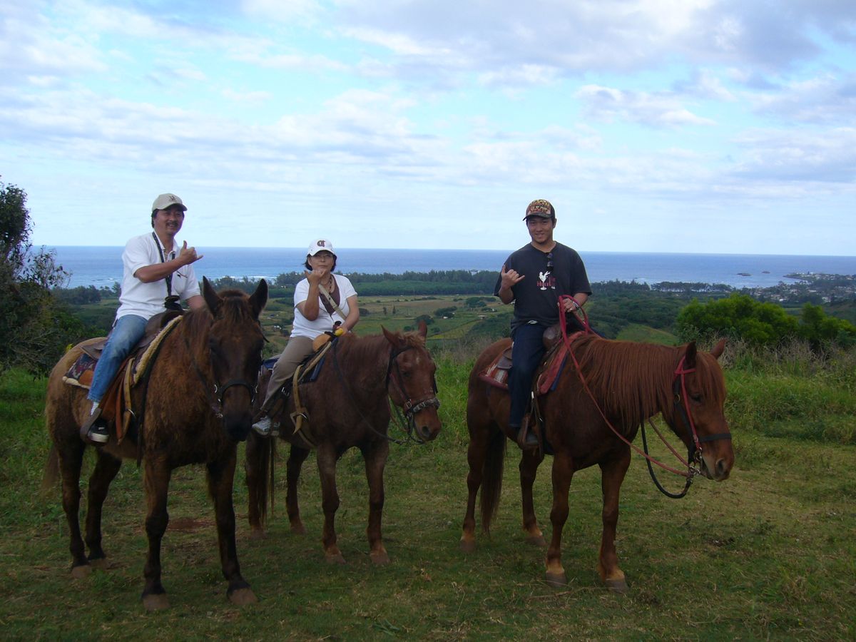 ハワイでは必ず乗馬をするファミリー家族です。今までにカウアイ島で1箇所、オアフ島で3箇所、モロカイ島で1箇所、マウイ島で1箇所、ハワイ島で1箇所、今年はラナイ島で乗馬でもしようと計画していたところ、ここガンストック牧場で昨年からやり始めたとの情報を得、わざわざ離島まで行って乗馬することを考えればかなりの時間の節約と考えさっそくネットでアフタヌーン乗馬を予約。ノースからカフクを通り過ぎ約5分ぐらいで右手に看板発見!右折して山側にすこし登るとまったく観光化されていない牧場のたたずまい、早速人懐こいワンちゃんや羊がよって来て歓迎ムード、奥へ放牧されている馬さんたちをよけながら先に進みガイドさん?たちを発見、みなさん女性でお話をしたら牧場主のスミス婦人とそのお嬢さんとコロラド州からハワイの大学へ来たアルバイトのお嬢さんの3人でした。まったく日本語は通じませんがまるでとなりの家へ遊びに行きチェックインも、アットホームな感じ、早速乗馬し我々家族だけのまるでチャーターしたみたいな一行は一路ロデオ練習場や馬を乗馬用になれさせる練習場を通り過ぎ山へ谷へ果樹園と思わせる木々の中を通り過ぎ馬上からグアバをもぎとり食べながら又山へ、1時間も登ると北はノースショアーからカフクそして北東の海海、この景色をバックに記念写真とビデオを撮り、山陰にかくれた太陽の夕日が先のカフクの南を照らすのを見ながらガイドとおしゃべりをしながら牧場中心地へ30分で下山。初めての海外乗馬の方にはお勧め出来ないが、観光乗馬に飽きた方、少し英語がお話できる方にはオアフ島では1番良いところと思います。オアフ島にいる事を忘れてしまいそうなきれいなサンセットを見させていただきました。