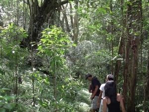 熱帯雨林なので雨が降りますが、用意したレインコートも全く必要がないくらい木々が傘になります。他の参加者はずべってお尻が汚れたりしましたが、最後に小川に入ってきれいに洗えるので大丈夫ですよ。きつさは、200メートルくらいの山に登る程度です。私たちのペースにあわせてくれますので、みなさんどんどん参加してみましょう。