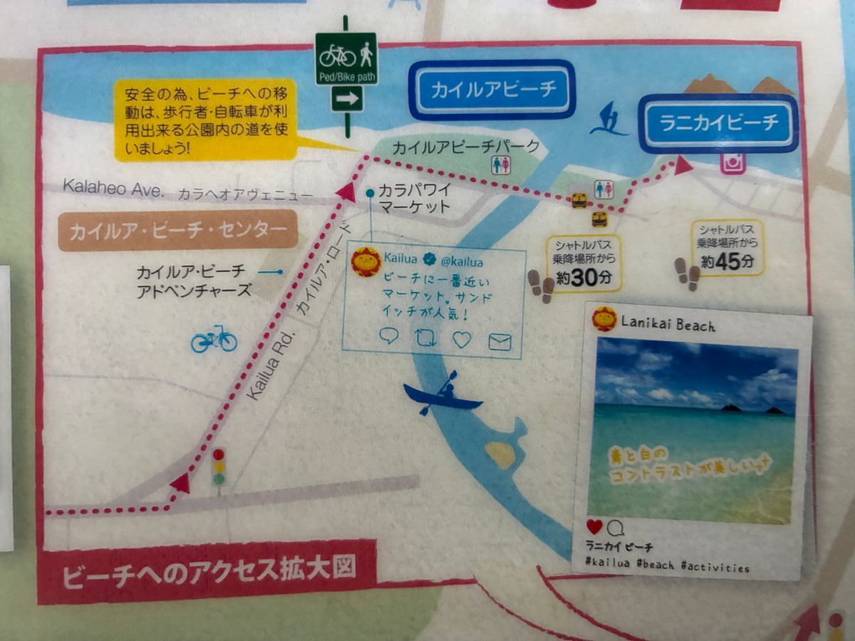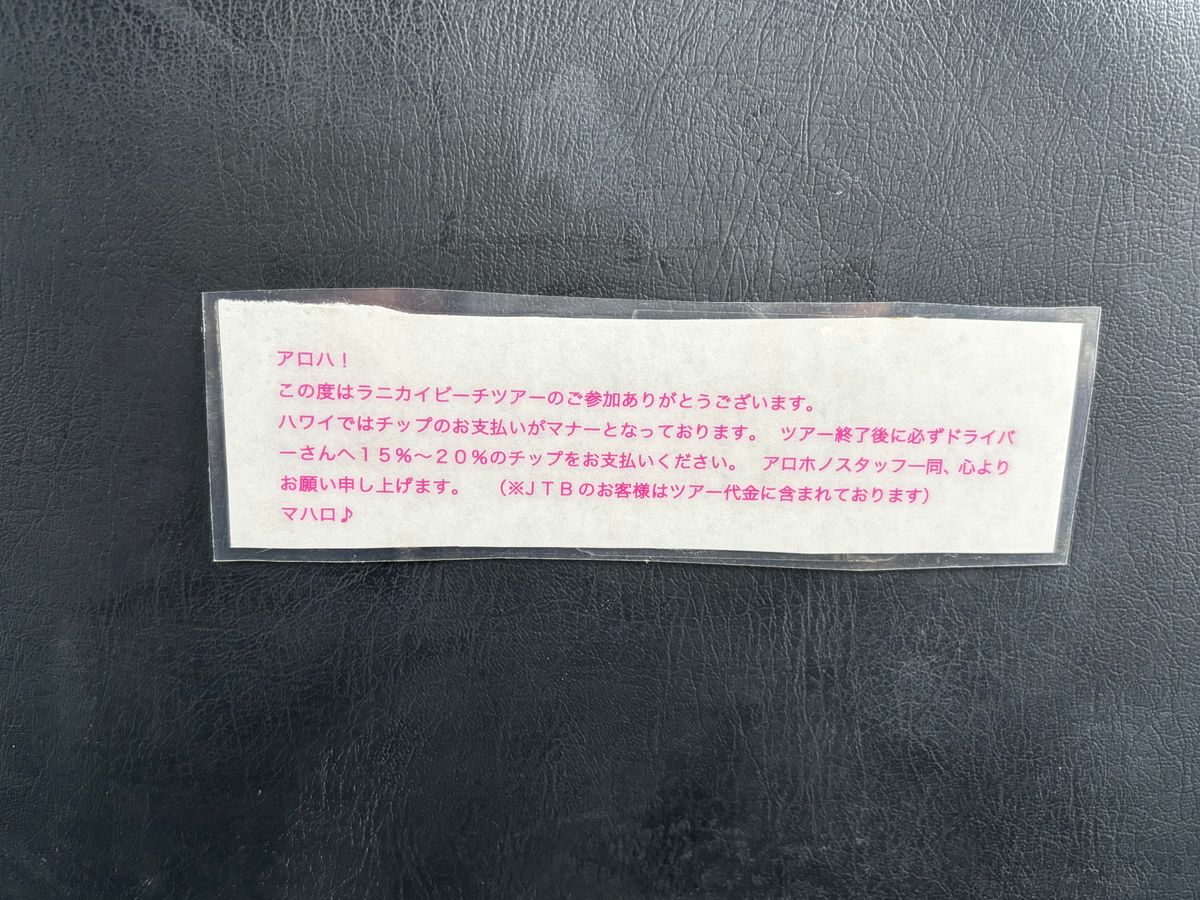ラニカイに送迎と、自転車を借りるだけの金額です。地図の配布もありません。確実スマホで地図の写真をとり終了、簡単な説明のみです。ガイドもなく各自で目的地までいきます。それに対して送迎バスの座席にこの張り紙はひどいかなと思います。写真を撮ってくれたり『ツアーらしいこと』をしてくださるのであれば話は違いますが、ただの送迎です。検討したほうがいいですよ!