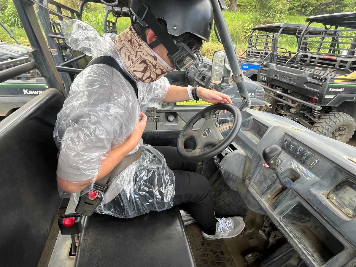前の車から砂埃が飛んでくるので、ゴーグル・バンダナをちゃんと付けて更に使い捨てのポンチョを持参すると汚れず良いと思います。私たちは予め100均で購入したものを持参しました。