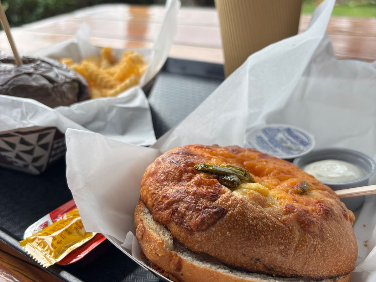 乗馬の後、カフェでコーヒーやタロバンズのマヒマヒバーガーなどをいただきました。