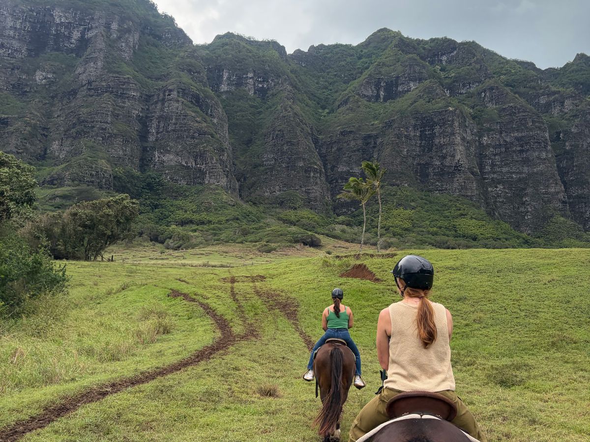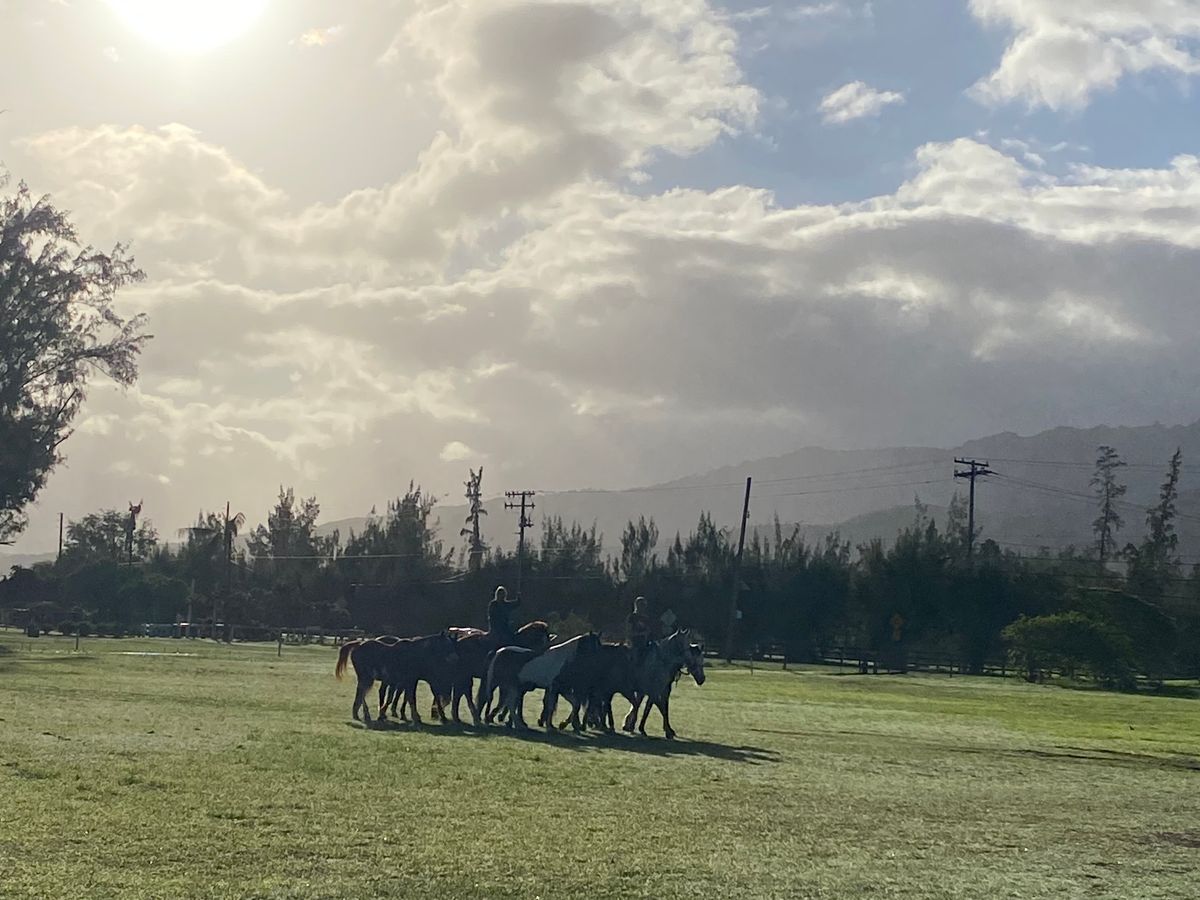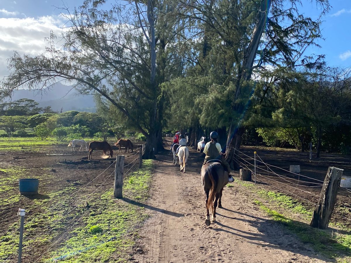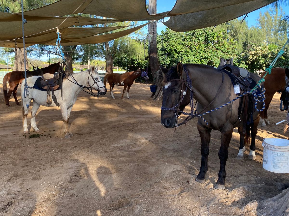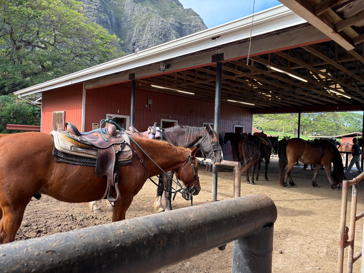 今まで乗馬をした事がなく、英語も話せないためとても不安でした。ですが、クアロアランチに着いてから英語で困ることは一切ありませんでした!私が行った時は天気が悪く雨がぱらついていました。事前に百均で買ったレインコートを持って行っていたのですが、乗馬前にヘルメット(必須)とレインコート(借りたい人だけ自由に取る)があったのでそちらを借りて行きました!途中でスコールにあいズボンはびしょびしょになりましたが上の洋服はレインコートのおかげで全く濡れませんでした。