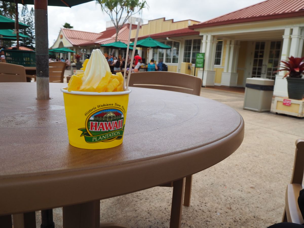 ドールプランテーションでは、濃厚なパイナップルソフトクリームを買うことができます。