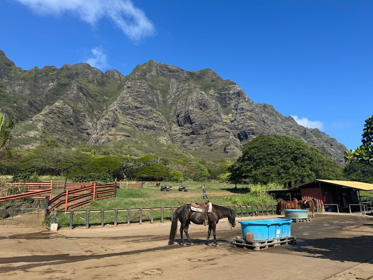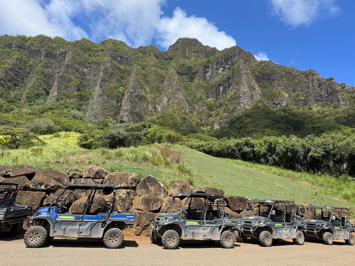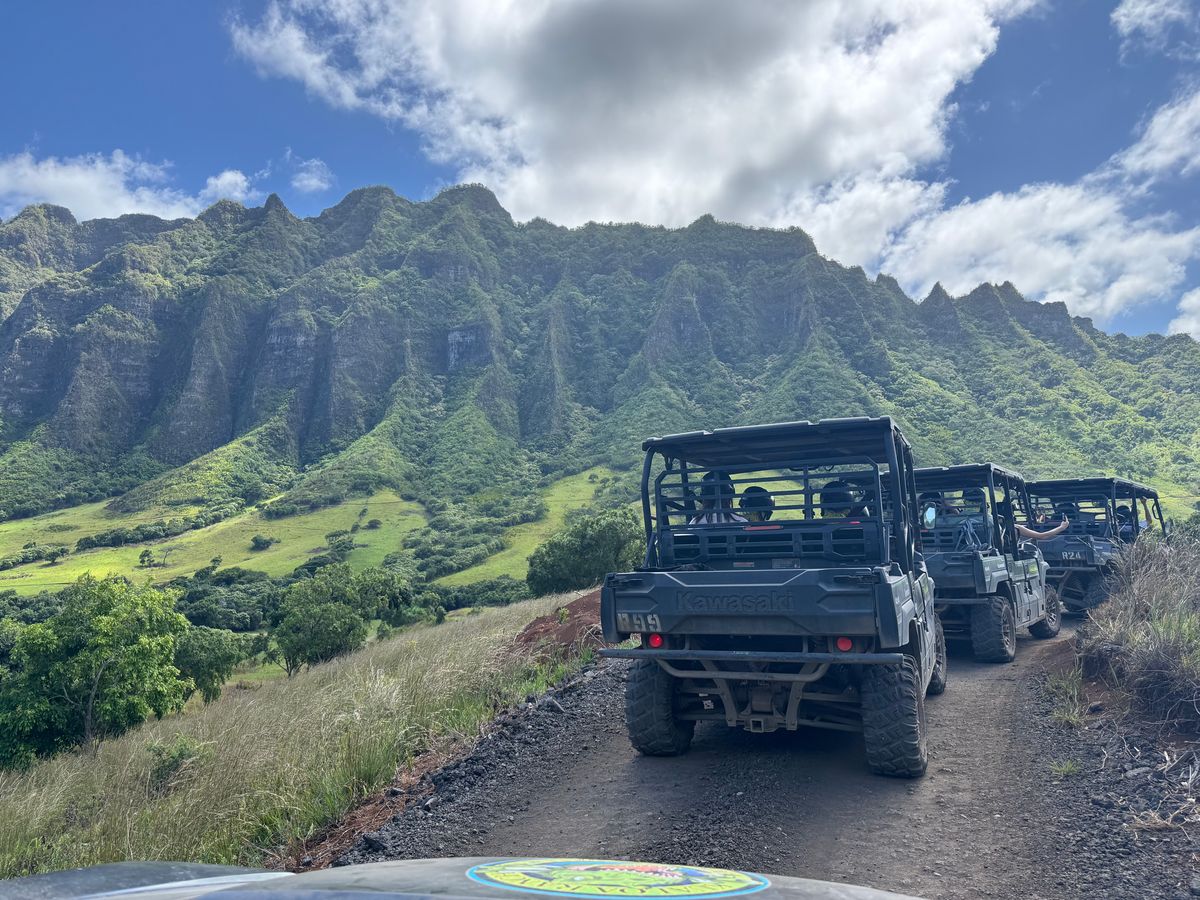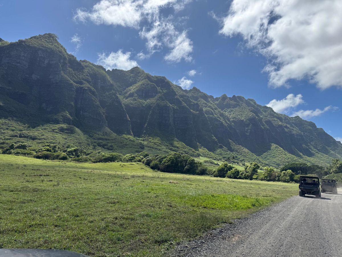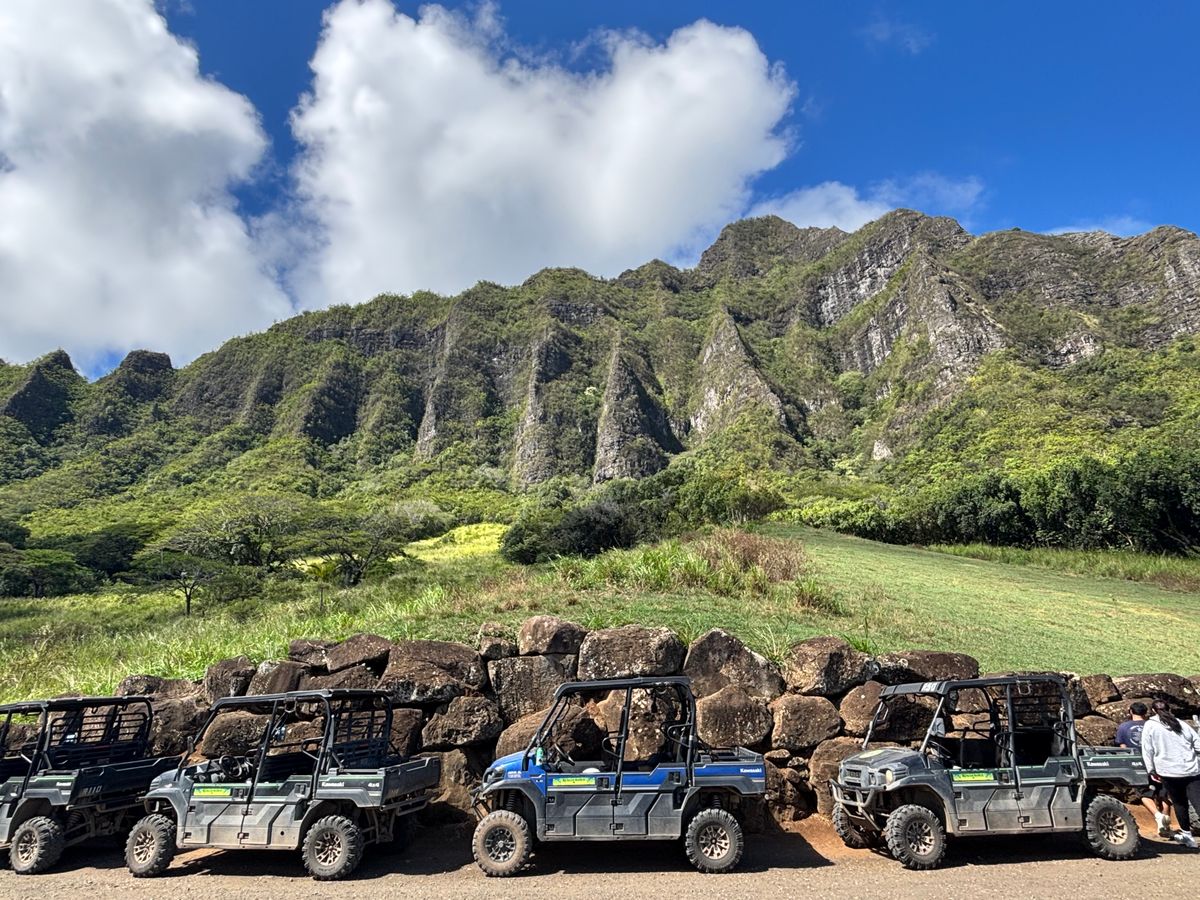 この日はクアロアランチのバギーツアーに参加しました。集合時間は10:15で、ツアー開始は12:00。集合場所はとてもわかりやすく、時間になると「Kualoa」と書かれた看板を持ったスタッフの方が案内してくれたので迷うこともありませんでした。参加者の中で日本人は、私たちを含めて2グループだけでした。