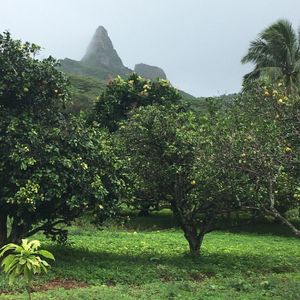 果樹園に向かう途中で、ハナウマ・ベイ、ハロナブローホール、マカプウを見学して、ガイドさんに記念撮影までしてもらい、果樹園に到着。