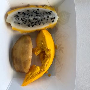 鮭のような果物も美味しかったしハニーパイナップルもあっさりして甘くて美味しかったです。運良くドリアンがあるということでお願いしたのですが剥いてはる時点で強烈な匂いだったので食べれるか不安でしたがメッチャ美味しかったです。主人の分まで食べちゃいました。