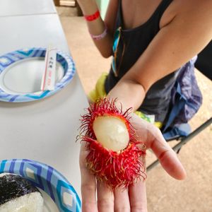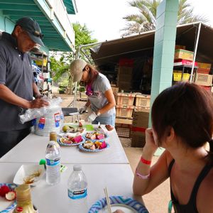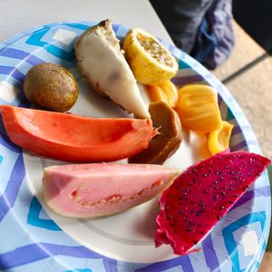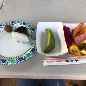 農園内はガイドの方と親子、夫婦での参加者7人アットホームな雰囲気ででまわりました。フルーツの種類がとても多く、聞いたことのないフルーツばかりでしたが、ひとつずつ丁寧に説明していただき、もぎたてをたくさん試食させていただきました。昼食は、たくさんのフルーツとおにぎりでした。山盛りのフルーツ(パイナップル、マンゴー、アボカドをおかわりしました)を食べたので男性の方々もお腹いっぱいになっていました。