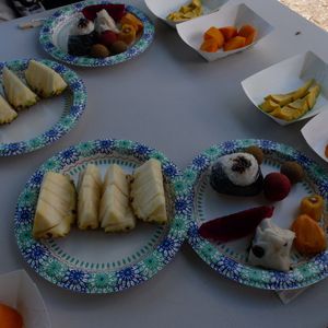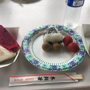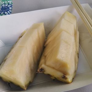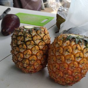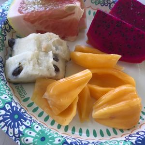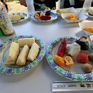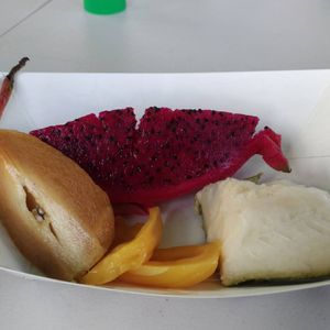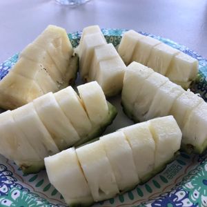 果樹園散策の後はテーブルでの昼ご飯。ここでも初めてのフルーツが皿に盛ってあります。名物のハニークリームパイナップルはほぼ食べ放題でした。