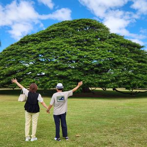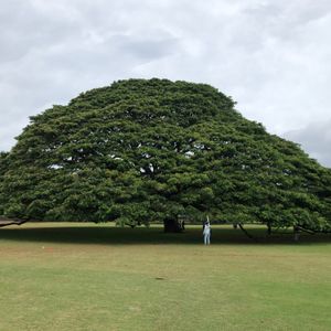 ハワイに行くと、私達夫婦はどうしても見たい木。公園が閉鎖してて、去年も一昨年もみれず、やっと行けました。パワーがみなぎって、おまけに花が咲いていて、感動。