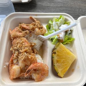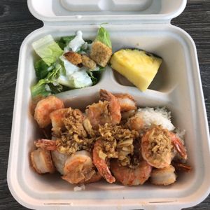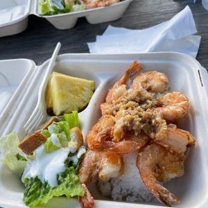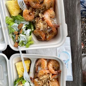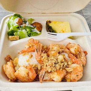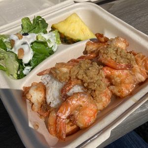 【ランチ】ガーリックシュリンプのエビが10尾以上ご飯に乗っててお腹いっぱいになりました。とてもおいしかったです。移動中に甲殻アレルギーの有無も聞いてくれる配慮もありました。ネットには水1本と記載がありましたが、1箇所目の展望台を出発時に1本とランチで1本、合計2本いただけました。
