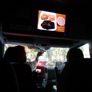 運転席の頭上にテレビが設置されていて、車での移動中も様々な画像をこのテレビに映し出しながら話してくださいます。