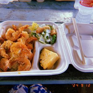 (1)お昼はハレイワタウンでガーリックシュリンプ。あらかじめ購入意思とメニューを聞かれた上で、ガイドさんが予約してくださいました。観光客に人気のあの店ではなく、ガイドさんおすすめのお店のガーリックシュリンプでしたが、とてもおいしかったです。