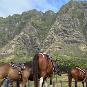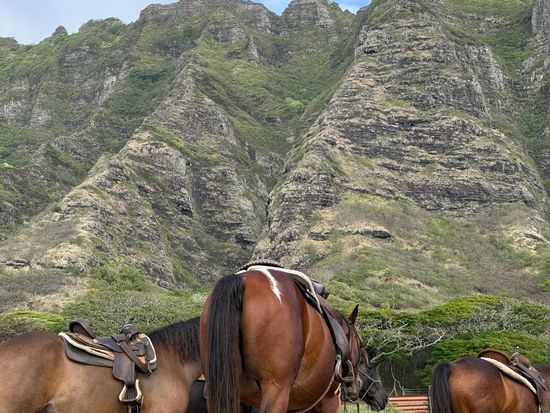 あいにくの曇り空でしたが、馬に乗ってクアロアランチを巡ることができました。1時間ほど馬に乗るので、お尻が痛くなりましたが、とてもいい体験をすることができました。ワイキキからクアロアランチまで送迎バスで1時間以上かかりましたが、大型観光バスだったので、揺れもせず爆睡することができました。乗馬の引率のお姉さんに、馬に乗った自分の写真をカメラで撮っていただいたのですが、あとから見返すとなぜか1枚も撮れておらず、乗馬の写真が残っていないのが残念です。