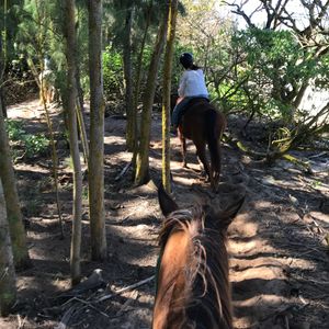 馬は馬自身の体型しか把握していないので、馬が通れるギリギリで木の横を歩くことがあり、人間の膝が木にぶつかりそうになりました。慣れてくれば馬に指示して事前に木をかわすことができますが、ケガのリスクを減らすためにもジーンズ等厚手の長ズボンをお勧めします。馬の背中は思っている以上に高いです。