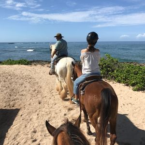 最初にドールプランテーションに行きました。30分程度各自で見学します。目的はトイレ休憩がメインであとは、ちょっとお土産を買うくらいだと思った方がいいです。この後、高速道路を使いますが、渋滞するときもあるらしいので、ドールプランテーションでのトイレ休憩は必須だと思います。ここには迷路もありますが、クリアに1時間以上かかるので、絶対にチャレンジ禁止です。次に亀がいる海岸に行き、15分程度見学しました。波が高い日には亀は来ないことが多いそうですが、運よく2匹見れ、写真も撮れました。その後に、ハレイワタウンで65分各自で昼食休憩がありました。内田さんが車で事前にハレイワタウンを一周し、お勧めの店を色々教えてくれたのでガイドブックが無くても大丈夫でした。目的の店にスムーズにいけるようにしてくれて、内田さんの心遣いに感謝しました。ファストフード店に行きましたが、食べ物が出るまでに15分程度かかり、日本のようにすぐには出ないので、時間配分は重要です。その後、乗馬をしました。ハイキングをするような木々の生い茂った小高い山を馬に乗って散歩しました。手入れのされてない自然の山を乗馬するのは気持ちよかったです。ポロ競技を引退した馬たちなので、ちゃんと調教されているので素人でも扱えます。とても楽しい一日でした。オーナーのマークさん、内田さん、ありがとうございました。また乗馬をするならここでやりたいと思います。
