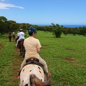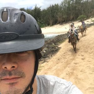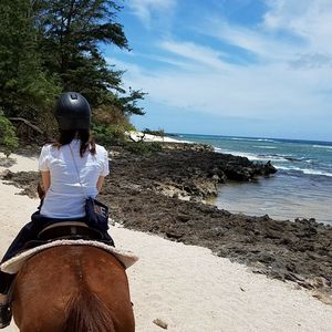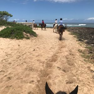 ハネムーンで初ハワイ。スポーツ万能な彼と運動音痴な私がお互い楽しめそう、と選んだのがこのツアー。当日の朝ホテルでハプニングがありましたが、ツアー会社の方が俊敏に対応して下さり無事ツアーに参加することが出来ました。アテンドさんは日本人男性で、車中から見える景色の説明やクイズなどをして下さり道中も退屈せずに過ごせました。ノースショア 観光はそれぞれが行きたい場所へ行けるので、インスタ人気の羽の壁で写真を撮ったり、マツモトシェイブアイスへ行きました。ウミガメビーチでは残念ながらウミガメは居ませんでしたがワイキキとは又違った雰囲気のビーチで景色だけでも楽しめました。お待ちかねの乗馬ですが、係の方を先頭に一列になって浜辺や森の中を45分かけて回ります。参加者のタイプに合わせた馬を選んでくれるみたいで、私を乗せてくれた馬はとても賢く、段差をゆっくり降りてくれたり列からはみ出さない馬でした。彼の方はすぐに草を食べに行ったり、馬間距離がバラバラだったりと中々やんちゃそうでしたが(笑)途中係の方が携帯で写真も撮ってくれます。自分で手綱を握りながら海を眺めるという最高の体験が出来ました。帰りに寄ったマカデミアナッツのお土産屋さんでは自分でマカデミアナッツを割って食べることが出来たり、色々なフレーバーのナッツがありお土産に買って帰りました。15時半にはホテルに着いたので、夜も有意義に時間を使えます。乗馬だけではなく観光も楽しめるとても満足なツアーでした!
