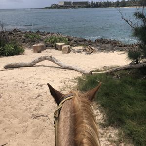 ウミガメは見れませんでした。渓谷は足場が悪くなったことから、海岸ルートの乗馬に変更になりました。1時間程度の乗馬はしっかりと調教された馬で乗りやすかったです。