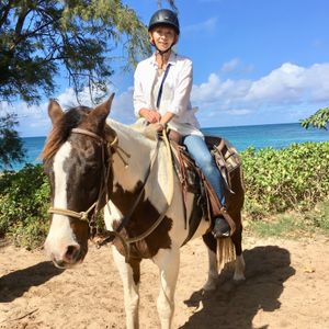 本来なら娘と2人での体験でしたが、当日体調不良になり、私1人での参加になりました。運転兼ガイドさんの説明も慣れており、楽しい車中になりました。まず、ドールプランテーションに10年ぶりに行きました。30分ほど見学し、その後、ホヌ(亀)が居るかもしれない海岸に残念ながら浜辺にはいませんでしたが、すぐ近くにいて、息継ぎに顔をあげます。そして、ハイレアへ。本来ならガーリックシュリンプの昼食を考えていましたが、1人参加になってしまったので、アサイーボウルに変更。美味しかったです。そして、いよいよ乗馬体験へ。慣れたガイドさんを先頭に2メートル間隔でゆっくり歩きます。海が綺麗で充実した時間を過ごすことができました。当日、体験者が4人と道路が空いていたので帰路にも、ハイレアで自由時間がありました。そして、ホノルルへ。とっても充実したツアーでした。
