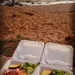 ドライバーさんがゴザを貸してくれてビーチで夕食&サンセット観賞。ここでは1時間以上の時間が取れてゆっくりしました。ちょっと時間を持て余した感じで、最初の公園やドールでその分時間とれたら良かったのになと思いましたが、ハレイワに入る際の渋滞などを考慮されていたのだと思い納得しています。