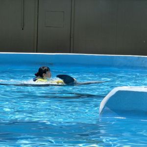 同じプールではロイヤルスイムをやっていましたが、これも2頭の背びれをつかんで10mくらい泳ぐのと、足の裏を押してもらってこちらも10m位進むのの2つを皆でやるので待ち時間が長いな~と思いました。