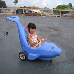 それと意外におもしろかったのはイルカショウのイルカのジャンプにあわせて思いっきり水をかぶるところ。 最近は日本の水族館でも体験できるけど、数mも上からかぶるのは迫力がかなり違いますよ! それと写真はイルカのベビーカー・・・これも子供達に大人気(借りる際は身分証明書を預ける。帰りに証明書を返してもらうのを忘れずに!)