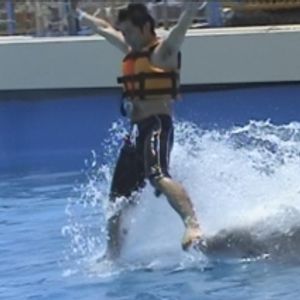 。ちゃんと背びれにつかまる事が出来るのか?足裏で押してもらってもすぐに落ちてしまうのではないか?と思いましたがその辺はイルカ達が上手にあわしてくれているんでしょうね・・・大丈夫でした(笑)外国人のファミリー4人と日本人3人のグループでプールに入る前にレクチャー(日本人用ビデオも前もって見ます)をうけましたが英語だったので何を言っているのか自分には分からなかったのですが途中、日本語スタッフの人が来てくれて説明してくれました。プールに入った後もインストラクターの説明や話を聞いて外国人ファミリーが笑っているのを見て一緒に訳してもらえるともっと楽しめたような気がしますがイルカと触れ合えるという点ではとても満足出来ました。その後、イルカと一緒に遊んでいる自分の写真とDVDを販売してくれるので、見学者の方(=撮影する人)がいない場合でも大丈夫かと思いますが