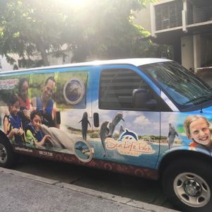 写真の車がお迎えし、っと思いきや、違うホテルででかいバスに乗り換えて行きます。行きの景色はなかなかきれいな景色、イルカとも泳ぎたくてツアーに参加しました。ホントに泳げます 少しですが・・・ 人数が5人ずつくらいで、流れ作業的なイルカとの触れ合い 笑い ピックアップも沢山いるので時間かかります。レンタカーで行くのがお勧めかも~ 日本のイルカShowの方が凄いと感じました。笑 園内での食事もできますが期待しないでください。普通です。園内のアトラクションはけしてたくさんはありません、オウムと写真撮るのも有料ですので・・・