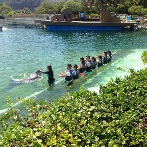 4才の娘と夫が参加しました。参加後に聞いたところ、水が汚かったそうで、娘が嫌がりほぼだっこの状態だったそうです。私と母(4才の娘のおばあちゃん)は、少し遠くの場所から観覧できるのですが、蚊がとても多く、ビデオ&写真を撮っている間、10ヶ所以上刺されてしまいました。イルカと遊ぶより、その後に行った、鳥が放し飼いになっているところのほうが、えさをあげたりして楽しかったみたいです。