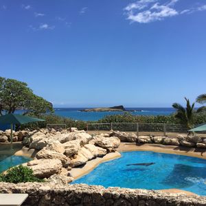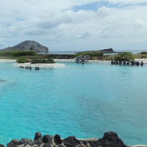 いつかイルカと泳いでみたい。海の遠くにイルカが居て一緒に泳いだ気になるんじゃなくて、イルカに触れて、一緒に泳ぎたいを実現できるのがここ シーライフパーク・ハワイです。出会いはクリスマスの日、着いた先はシーライフパーク・ハワイ 道中海の景色も抜群です。うちの家族は園内に入りホヌ軍団に圧倒されました。とにかくかわいい。待ちに待ったイルカとの対面。またイルカたちがかわいいのナンの(笑)イルカと泳ぐ際の説明も英語、日本語の説明で心の準備OK!説明してくれたBoy'sシャツの裾を気にしているところがかわいいかった。そして本番!自分が泳げないとか、浮輪チョッキを着ているから溺れる心配無し。プール内は深いところもありますが、私も決して痩せているほうではありませんが、勝手に浮いてしまいます。足を鎮めることが大変なくらいでした。イルカがいたずら好きというよりも、トレーナーのお姉さんがいたずら好きなので、イルカの仕草、動き何もかもかわいい。イルカの背中、イルカのお腹、背びれとイルカがゆっくり泳いでいるところをみんな一列になって触るですけど、ここもビデオに撮られています。続いて、イルカを抱っこする形で写真撮影、続いてイルカとの接吻ここでも記念撮影、そしてイルカの背びれにつかまって一緒に泳ぐ、続いて、2頭のイルカが私の両足を1頭づつ押してくれて立ち上がっちゃうぐらい押してくれます。ここでプログラムは終わっちゃうんだけど、トレーナーさんの粋な計らいでイルカと少し戯れられる。もっともっと泳ぎたかった。
