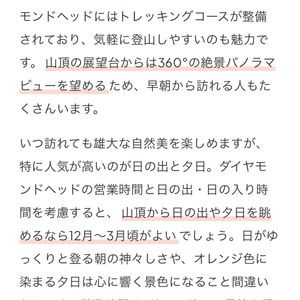 ダイヤモンドヘッドの山頂から日の出が望めるシーズンは、【12月から3月】それ以外だと、見られません。なので、日の出の時間とダイヤモンドヘッドへ行く時間を確認してから決めたら良いと思います。日の出が見られるシーズンはベルトラの公式サイトに載ってます。