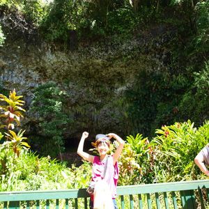午前中にシダの洞窟に行くはずが前日の大雨で午後に変更。ガイドさんが本社と掛け合いながらアクティビティの順番を変えたがベテランガイドさんだったのでスムースに進行した。洞窟の中には入れなかったけど、見学ステージが広くとってあり、ウクレレ、ギター、ヴォーカル、フラで雰囲気を盛り上げていた。ここに来ると幸せになるということでカップルが多く白人のカップルはバンドに促されてキスをしていた。結婚50年のカップルもいて霊験を確認。昼食は昔の建物を改装したホテルで庭に面したテラスで映画のような雰囲気でした。味もタロイモパンも含めて日本人向きでした。テラスから海岸まで食後の散歩をしたりしてゆったりできました。バンドもブルーハワイで演奏した人だったり、フラも現地のかわいい子だったりで善かったですが、特筆すべきベテランガイドは花の名前や映画やCMの舞台になった場所の話など盛りだくさんで楽しめました。現地に住んでいるだけに大変詳しい。結婚50周年にまた来ます。
