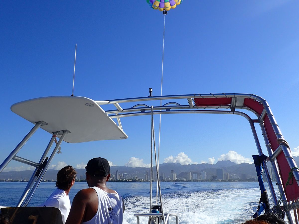 最初9/7,10:00を予約したのですが、港に着いた時から雷が鳴りだし、船長の判断であえなく欠航。当日の一番早い空き時間帯13:00で再予約でき、今度は飛べました!バリ島でも2回体験しましたが、ハワイのはずいぶん沖まで出て、高く高く上がったので3人とも大満足~港から沖までのモーターボート体験も面白かった。お迎えがとかくココナッツタイムと、よく聞きますが、私たちの場合は、むしろ外に出たらもうバスが待ってる状態でびっくりしました。ただ船の帰港は遅れがちな感じで、あまりタイトな予定を組むとイライラするかも。チップは8ドルって船内に表示があって、1ドル札を準備していなかったのでうろたえて、多めに渡してしまい、送迎のヤノさんのチップが無くなってしまいました…ヤノさん楽しい話、飲み物サービスに感謝しています。チップ渡さなくてごめんなさい。貴重品が心配で、最小限の現金だけで、カード持って行かなかったけど、も少し持って行ってSD買えばよかった