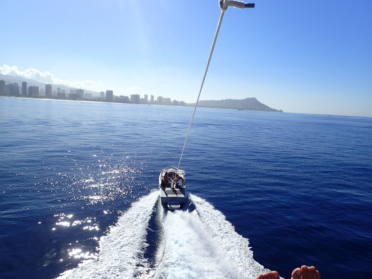 最初の船からパラセイルがふわっと浮く瞬間はちょっと怖かったですが、そのあとは、とっても楽しく、また空からワイキキとダイアモンドヘッドが一望でき、とても素敵な体験ができました。150mだと飛んでる時間もかなり長く、大満足です。今回一緒に飛んでくださった女性の方とはフランクにいろいろお話できたので、よかったですが、他の方と飛ぶのはちょっと、、、、という方は、2名〜3名での参加をおすすめいたします。