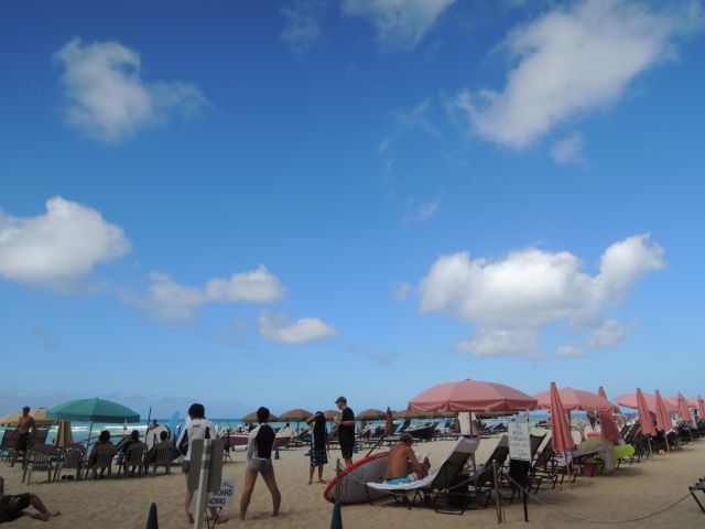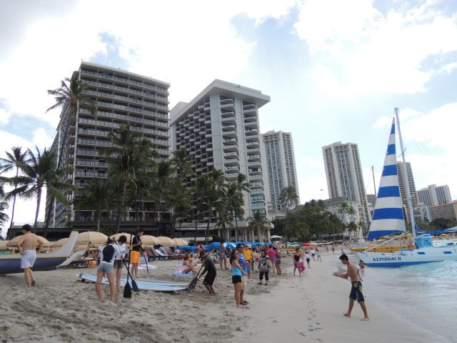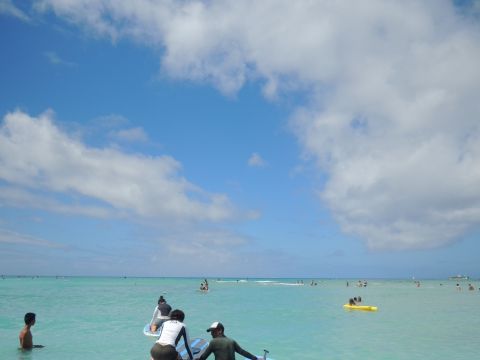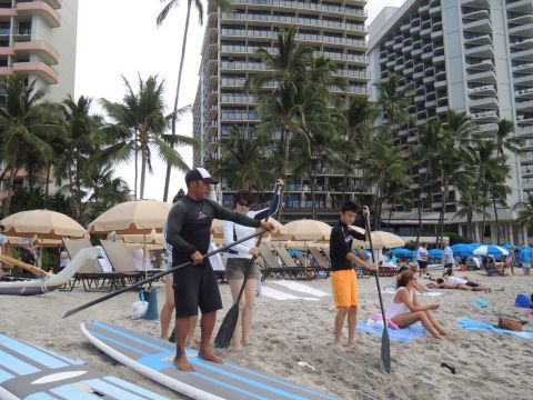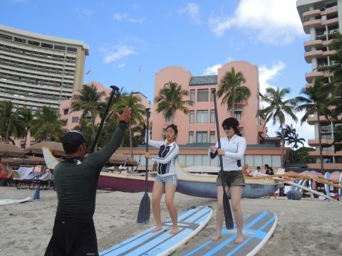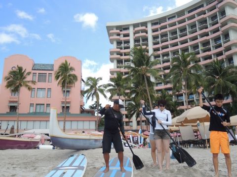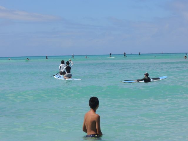 7/30「スタンドアップパドル初心者プラン」に参加しました。当日は9:30に集合場所のロイヤルハワイアンホテルのプールサイドに行きました。受付後、10:00時のレッスン開始までスタンバイ。スタッフの方から注意を受けレッスンが始りました。初めて経験する「スタンドアップパドルサーフィン」ですが陸上でシュミレーションを行いいよいよ海に入ります。最初は緊張していましたが、徐々に慣れてスタンドアップ&パドリングすることができました。あっという間の1時間レッスンでした。