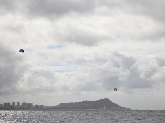 空中では見晴らしがよく、ダイアモンドヘッドを一望出来ました。風が気持ちよく、あまり揺れている感じはしませんでした。ボートから飛び立つので、今日は濡れないな~と思った矢先、スピードを落として海に落っことされました(笑)