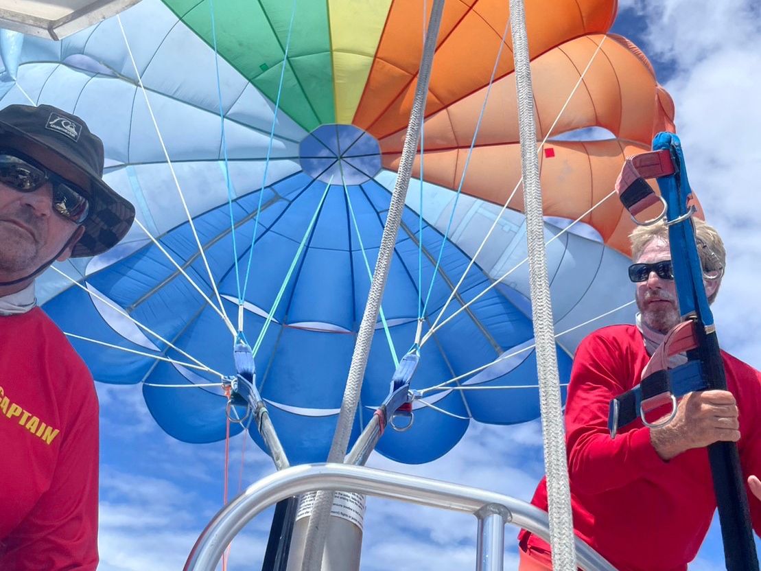 当日は風が強く、ツアーの実施はキャプテンの判断との説明を受けましたが、無事に出航して、参加者13人全員がパラセーリングを楽しんでいます。