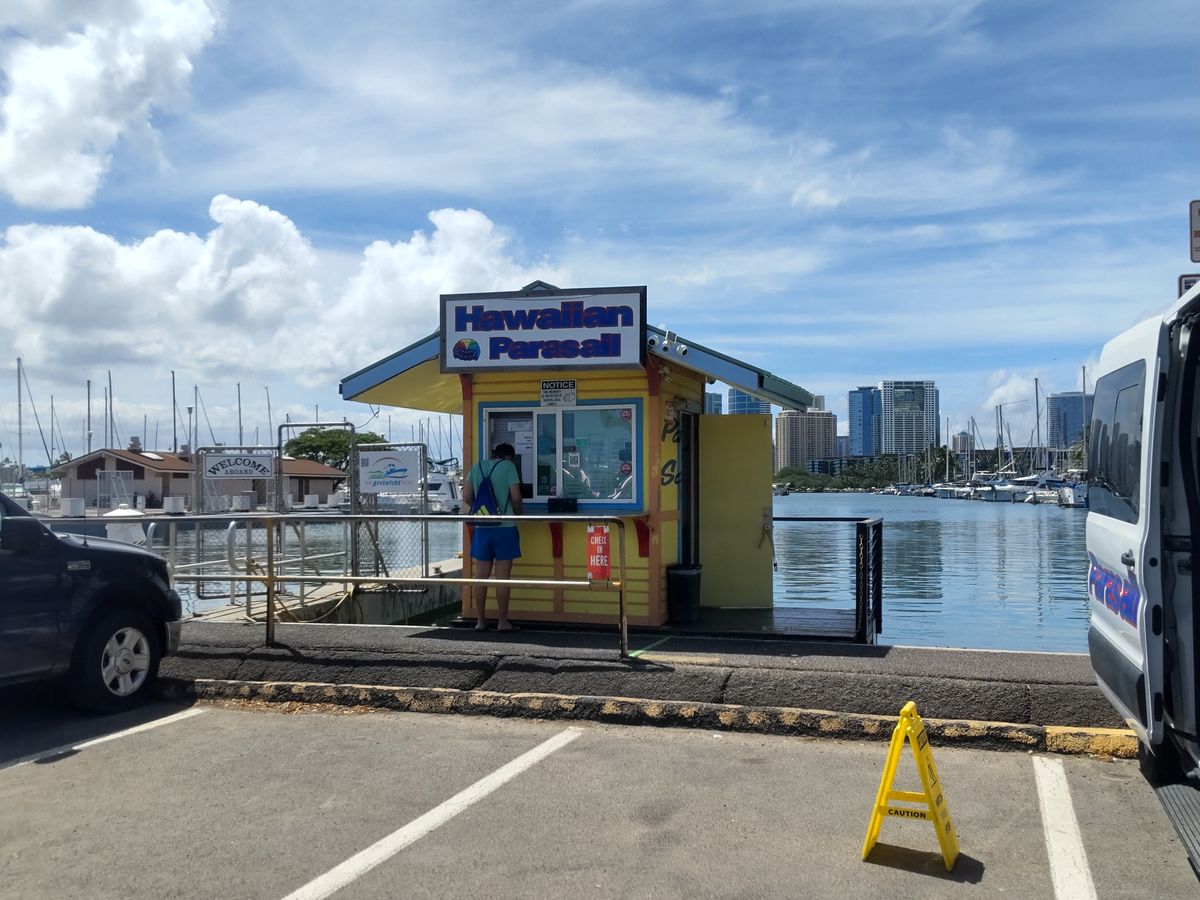 宿泊しているホテルから集合場所まで距離があるため送迎付きのパラセイリングを探していましたが、土日やっているのは、当ツアーのみだったため出国前日に申込みました。宿泊ホテルから集合場所までは徒歩15分くらいで、意外と簡単に行けました。ヒルトンハワイアンビレッジ宿泊の方はすぐです。口コミで船酔いすると記載があったため事前に酔い止めを服用し、いざボートにのってみると、アメリカ本国からきた家族2組と私たちで、皆さん気さくでアットホームな方たちで、とても楽しかったです。いざ、自分たちの番が来て、パラセイリングで飛び立ちましたが、150フィート、とても高くて怖かったです。でも、ボートから皆が手を振ってくれ、ワイキキやダイヤモンドヘッドの景色が素晴らしく、とても良い体験ができました。10分以上飛んでいるので、お得なツアーだと思います。船酔いもせず、本当に楽しかったです。おススメです!