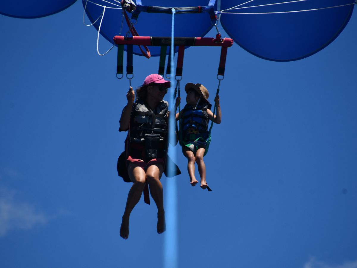 母娘で参加しました。沖に向かうボート内で、二人は軽すぎて駄目だと言われて焦りましたが、乗り合わせた他のママが一緒に飛んでくれることになって、無事に体験できました。そのママも自分の家族とうちの回とで2回飛べたので、こちらとしては名乗り上げてくれて大感謝ですが、悪いことをしたわけでもないと思いますw 軽すぎて駄目と言われたら、乗り合わせた人に「誰か一緒に飛んでください」とお願いしてもいいと思います。