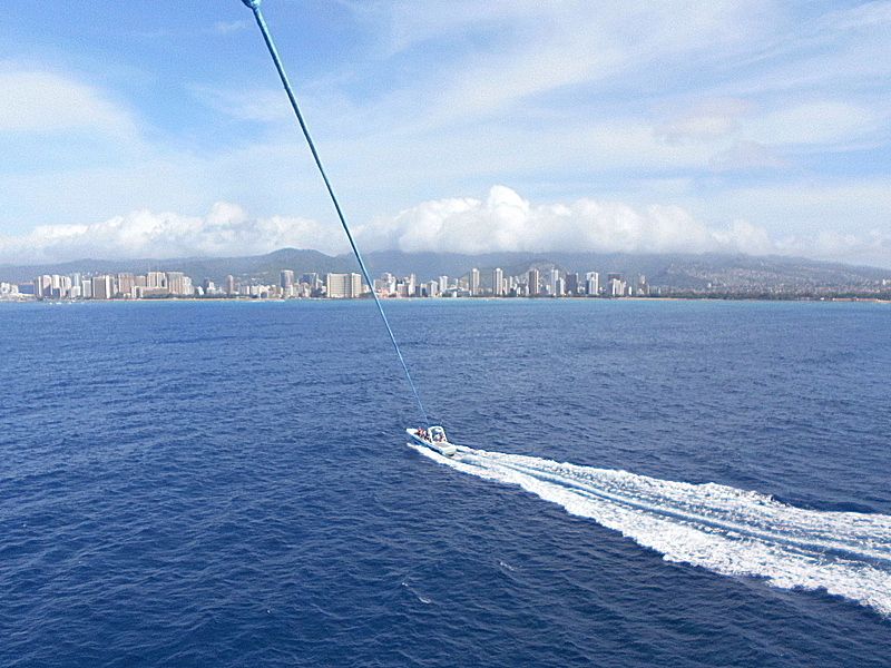 ふわりと上がって、恐怖心もなく二人でニコニコ顔、目の前にはワイキキのホテルと青い空と青い海、最高でした。