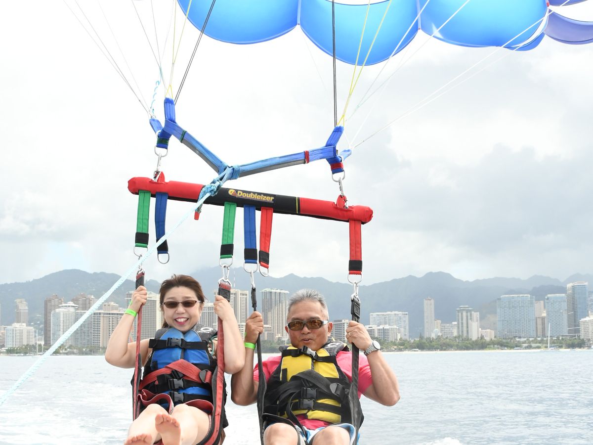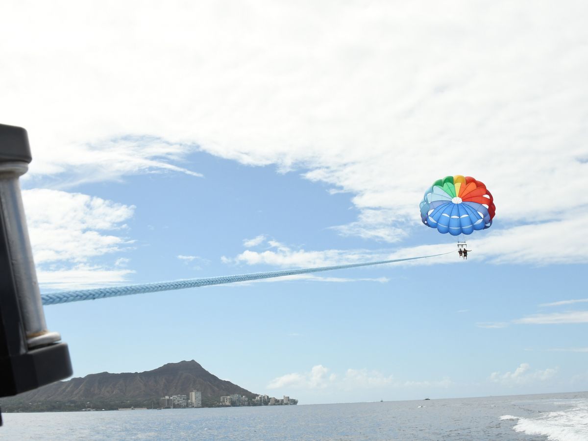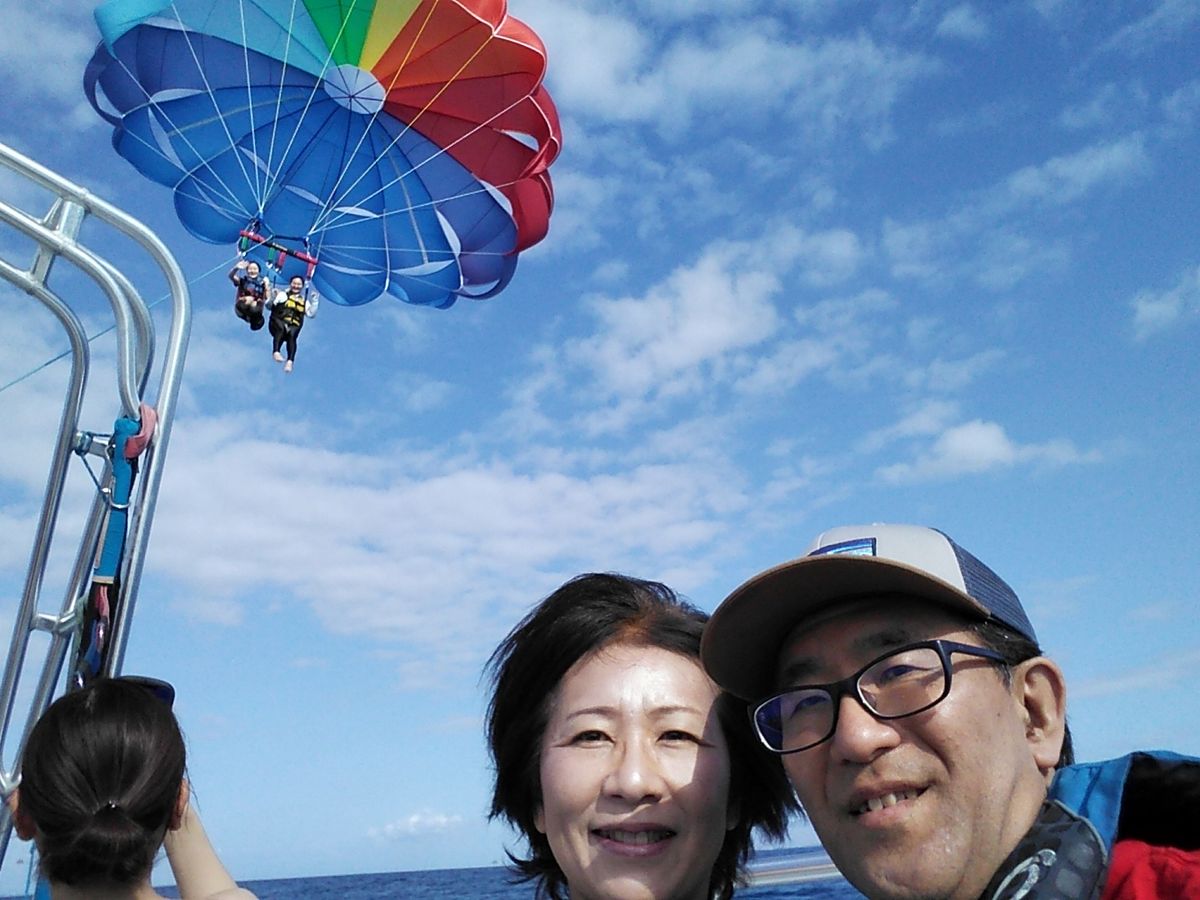 今回で7回目のハワイですが、夫の希望で初めてパラセイリングに挑戦しました。一番低い、90メートルの高さでしたが、海の上からダイヤモンドヘッドとワイキキと海が360度見渡せてすばらしい景色でした。スタッフは現地の方で、英語と片言の日本語で親切に説明してくれました。他の人がやっているのを見ている間も、場を盛り上げてくれて楽しかったです。参加して良かったです!