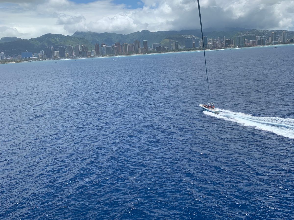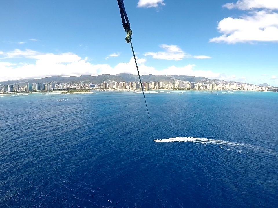 海上120mのパラセイルは、とても気持ちの良いものでした。海の上からの景色は最高でした。音はほとんどなく、心地よい風の音のみでした。ダイアモンドヘッドをバックに、快適な時間を過ごす事ができました。船長さんはとても楽しい人で、ボートの上からたくさん写真を撮っていただきました。写真は購入可能です。子供たちも、大満足のアクティビティでした。