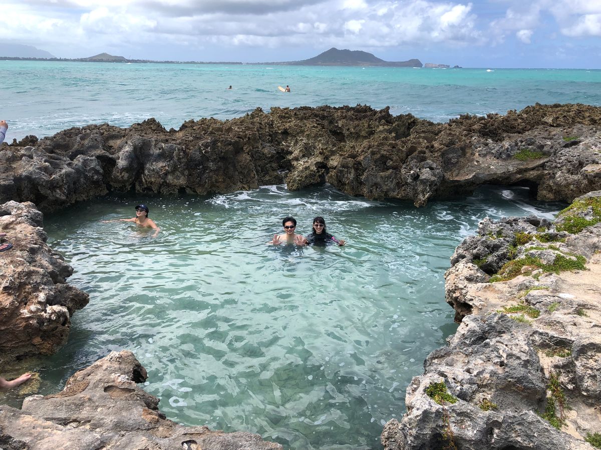午後になり、お目当てのカヤックタイム!この日は風が強く、波も高い状況でかなり引きましたがガイドの方に背中を押され、しぶしぶスタート・・・。でも乗ってみると案外大丈夫で、スタッフの方の声がけやアドバイスもあり、目標の島に向けてスタートできました。最初はぎこちなかったパドリングも少しずつ学習し、何とか島にたどり着くことができました。島一周の散策もガイドの方の解説でとても楽しかったです。帰りは行きとは逆に波に押されてあっという間にカイルアビーチに到着。次回は是非、沖に見えていた双子の島へチャレンジしたいと思います。
